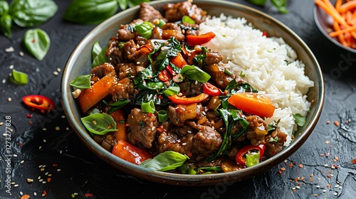 Homemade Thai pad kra pao, a spicy basil stir-fry, no shadows The dish takes center stage, with no text, logo, signature, human body, people, or plants,