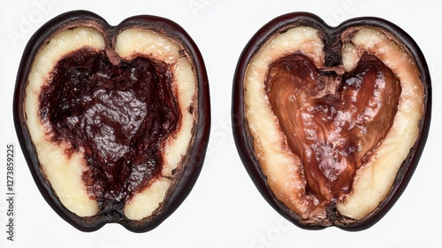 Cut Open Seeds Displaying Brown And White Heart Shaped Texture Against A White Background
