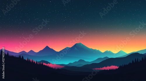 Japanese-inspired minimalist night scenery, stylized green and blue mountain ridges, delicate pink trees, a dark navy-blue sky with traditional soft star clusters