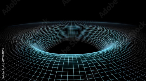 Wormhole in deep space with curved gridlines and glowing center, futuristic concept of spacetime travel, black hole theory, and interdimensional physics. Glowing Parallel Dimensions. Illustration