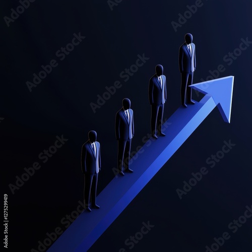 Corporate success and scalability, professionals standing on a glowing blue arrow leading to a bright financial future, 3D illustration