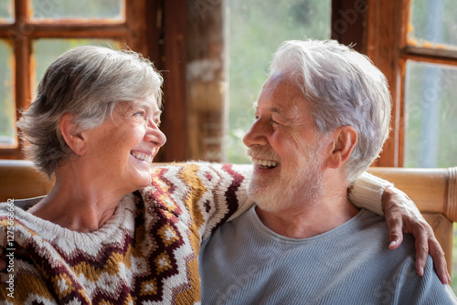 Elderly couple in mountain chalet hugging with affection while smiling, enjoying intimate moment together indoors during relaxing vacation, showing happiness, love, romance, connection and bonding