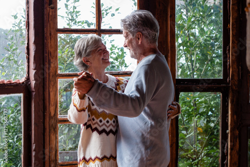 Elderly couple dancing indoors at mountain chalet during vacation in modern home setting showcasing mature love, lifestyle ease, vibrant well-being, joyful harmony, and serene romantic interaction
