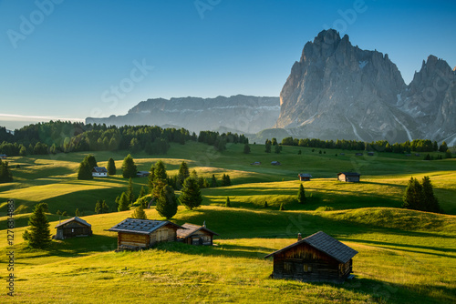 Chalets at Seiser Alm, high altitude meadow with Langkofel mountain in background at sunrise, Dolomites, South Tyrol, Italy