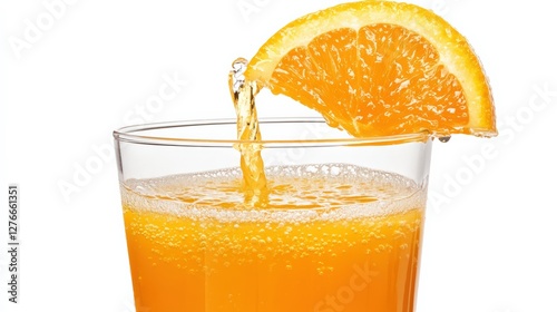 Refreshing orange beverage being poured into a glass with a slice of orange on the rim