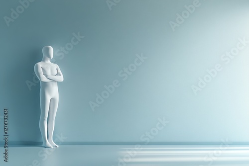 An introverted and shy individual, depicted in a 3D illustration, stands with arms crossed, back against a wall, silently watching the surroundings, in a withdrawn mood, without showing their face