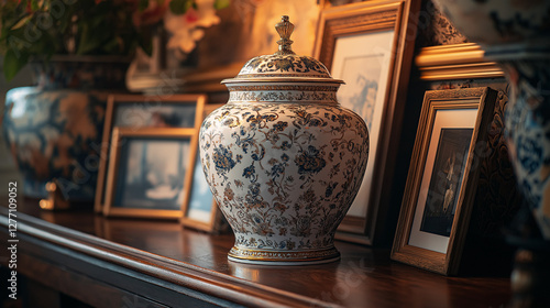 Elegant decorative urn and vintage photo frames arrangement for classic home decor