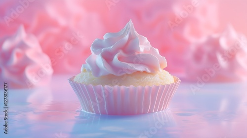 Ein köstliches Törtchen mit einer luftigen Sahnehaube, präsentiert in einer verträumten, rosa Fantasie-Kulisse. Perfekt für süße Genussmomente, Backthemen und romantische Food-Konzepte.