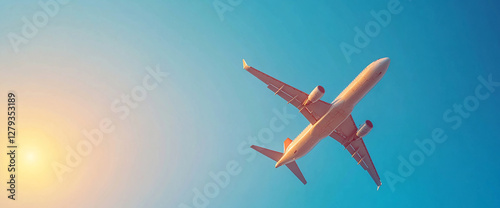 A passenger airplane flying against the backdrop of a bright sky with a clear blue color, representing air travel, freedom, and the concept of journey and exploration.