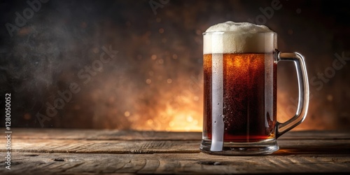 A frothy root beer mug sits on a wooden table