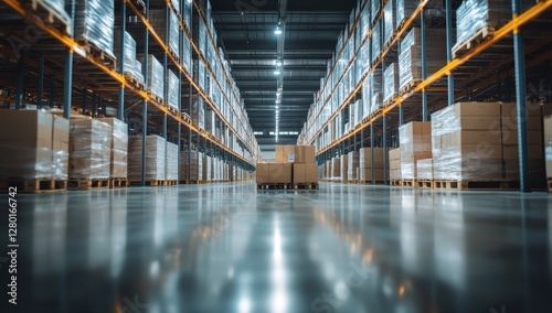 Warehouse interior, full shelves, boxes, organized. Possible use Stock photo