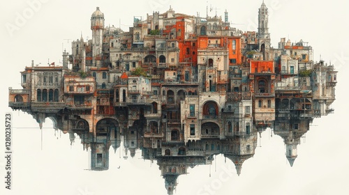 Intricate urban agglomeration suspended mid-air, complex architectural design with warm color palette evoking a surreal cityscape concept