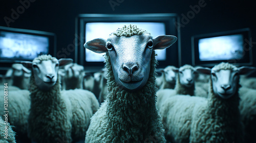 Sheep with tv screens, brain addicted to social media, manipulation and mind control by media, disconnected to reality. Moonstream. Illustration