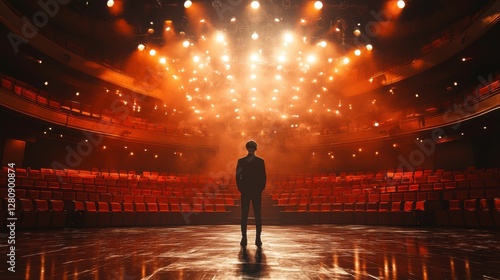 A performer stands alone on stage, illuminated by bright lights, with empty red seats in the background, creating a dramatic atmosphere.