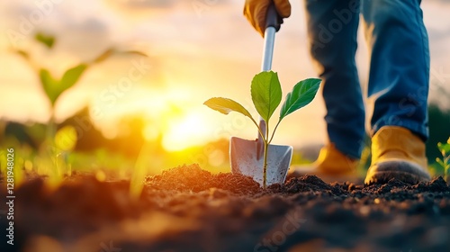 Hombre trabaja en el campo cavando un hoyo en tierra suave al atardecer