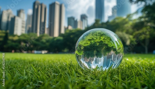 Glass Sphere Reflecting a Tree in a Vibrant City Park