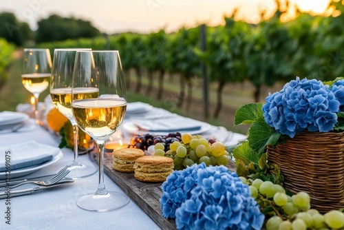Sunset Vineyard Dinner: White Wine, Grapes, and Hydrangeas