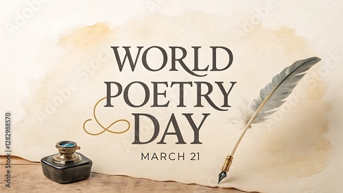 Poetry writing concept featuring quill pen, ink bottle, aged paper, and artistic calligraphy in a vintage-inspired setting that evokes creativity and the timeless beauty of written expression