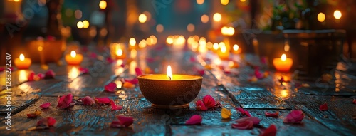 serene scene with glowing candles and scattered rose petals on wooden surface, creating peaceful ambiance. warm light reflects tranquility and introspection