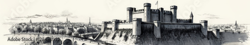 Detailed monochrome drawing of the Bastille from a distance with bridge and skyline for Bastille Da