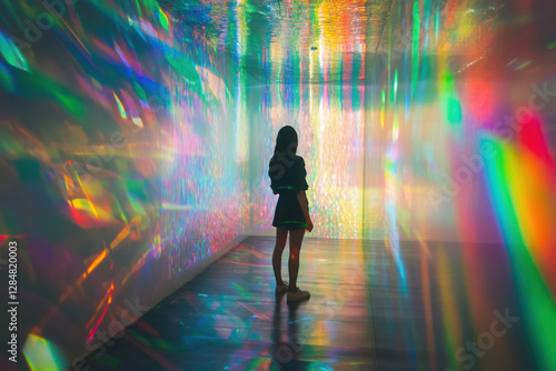 Silhouette of a woman standing in a vibrant room illuminated by colorful, prismatic lights, creating a dreamlike and immersive atmosphere.