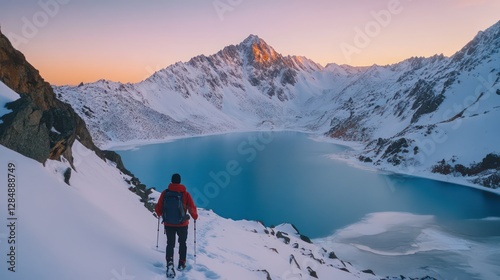 Almaty, Kazakhstan A traveler hikes up the snow-capped peaks near Big Almaty Lake, the icy waters glowing blue.