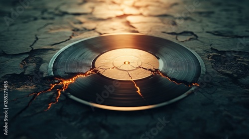 Ethereal Glow of a Fractured Vinyl Record, vintage charm illuminated by radiant light, a fusion of nostalgia and modernity