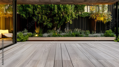 Modern outdoor space with wooden deck and lush landscaping in evening light