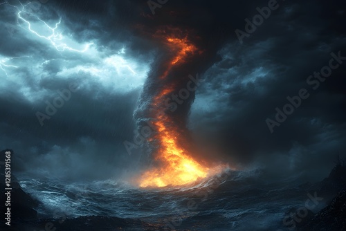 Apokalyptischer Feuertornado über stürmischem Ozean mit Blitz und Rauch