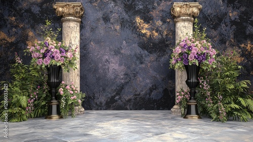 Elegant floral arrangement, classic columns, dark wall, wedding backdrop