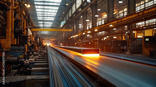 Vibrant Steel Production Line in a Modern Metal Industry Factory with Hot Steel Slab Moving on Conveyor Belt