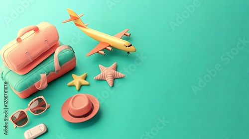 Summer vacation concept, 3D illustration of airplane and vacation attributes