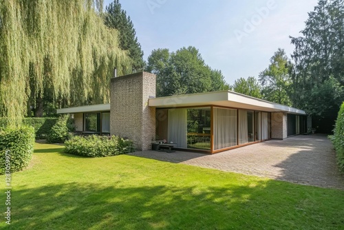 Modern residential house surrounded by greenery featuring large windows and a patio area in the peaceful outdoors during a sunny day