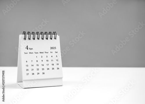 April 2025 page of desk calendar for organizer to plan and reminder, standing on white table on grey background with copy space. Small table calendar, front view, with the fourth month.