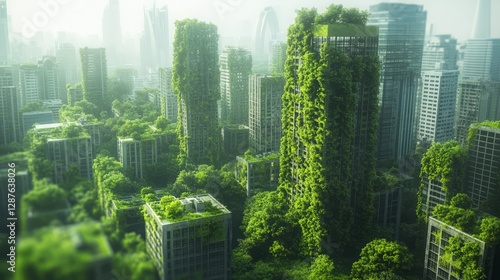 A city where nature has taken over, skyscrapers enveloped in vibrant green vines, trees growing on rooftops, peaceful and rejuvenating scene