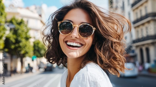 A smiling woman wearing sunglasses and a white top, standing on a street with her hair blowing in the wind.