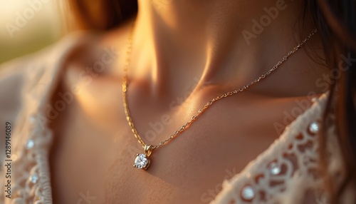 Close-up shot of woman wearing elegant 18k gold necklace with diamond solitaire pendant. Luxury jewelry on skin. Glamour, wealth, investment and beauty product advert concept.