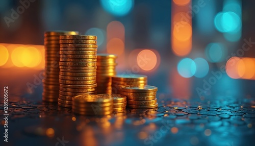 Piles of golden coins on abstract blurred background. Budget, investment, savings planning. Concept for cost optimization, efficiency, infrastructure, automation. Economic performance, value,