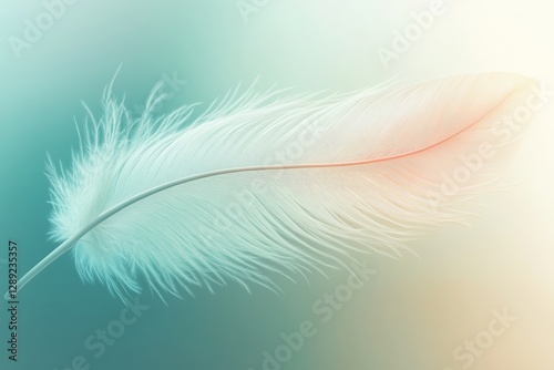 A delicate white feather with a soft, fluffy texture is set against a blurred light blue background with a soft focus, creating an abstract and artistic image of nature