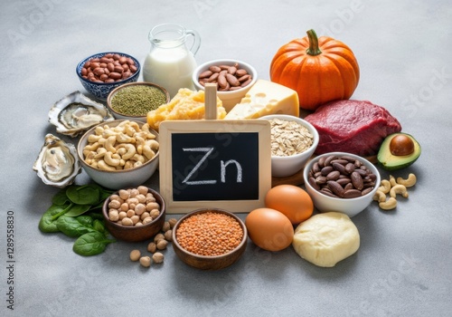 Assorted foods rich in zinc including nuts, seeds, and dairy on a gray background