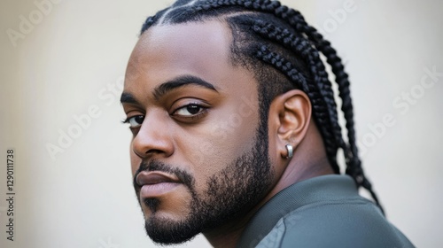 Man with cornrows exudes strength and focus, captured in dramatic side lighting.