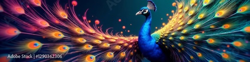 Abstract peacock feathers, vibrant colors, mating dance, fantasy, backdrop, art
