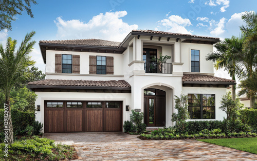 Lujosa villa americana de tipo español con dos plantas, con fachada blanca, tejados clasicos y garaje con puertas de madera y ventanas con contraventanas de madera