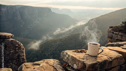 Morning coffee served on rocky ledge with misty mountains in the distance, creating a serene atmosphere