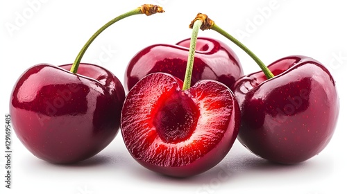 Fresh, Juicy Red Cherries with One Half Cut Open Displaying Natural Texture and Color