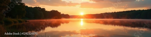 Golden hour light bathes lake, tranquil scene, Minnesota summer evening , evening, clouds