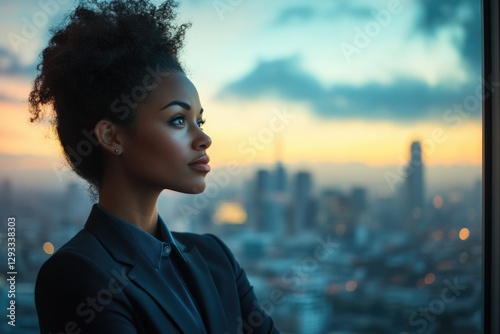 A young Black businesswoman looks out at a city skyline at sunset, contemplating her future.