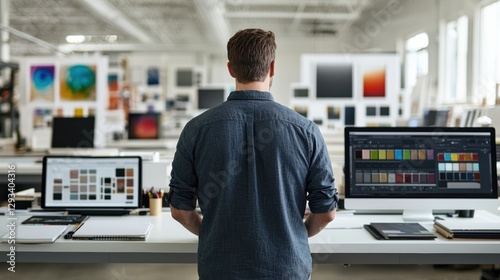 Graphic designer working in a creative office. Man standing in front of his desk with two computers and color swatches on the screen.