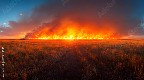 Wildfire's Fury: A vast landscape is engulfed in flames under a dramatic sunset, creating a scene of raw power and destruction.