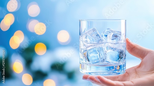 A clear glass filled with ice cubes is held in a hand, set against a soft blue background with blurred bokeh lights, ramadan fasting purity gratitude eid ul fitr mubarok